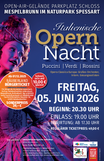 Verbringen Sie eine Sommernacht unter Sternenhimmel am Schloss Mespelbrunn. Am Freitag, den 05. Juni 2026 nimmt Sie das internationale Ensemble der Opera Classica Europa mit einer Italienischen Opernnacht auf eine musikalische Reise nach Italien. Italien und Musik – eine untrennbare Verbindung! Nicht nur die berühmtesten Opernkomponisten stammen aus diesem Land, auch viele andere Opern sind in italienischer Sprache geschrieben. Und eben deren Wirkung ist immer wieder ein Phänomen: Der Oper gelingt es, mit phantastischer Musik die Gemüter und Gefühle des Publikums in Wallung zu bringen. Ob Verdis ‚La Traviata‘, Puccinis ‚Tosca‘ oder Rossinis ‚Barbiere di Siviglia– ‘ die Meisterwerke sprühen nur so vor Leidenschaft! Starke Charaktere singen von Liebe, Verrat, Trauer und Sehnsucht. Lassen Sie sich von dieser exklusiven Darbietung der schönsten Opernarien im Naturpark Spessart verzaubern!